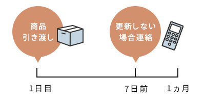 登録ユーザーへの商品引き渡しが完了した日を起算日として、1か月とし、レンタル期間の末日から7日前までに、登録ユーザー又は当社から更新しない旨の意思表示がない場合には、レンタル期間は1か月延長され、以後同様に1か月毎の延長となります。
