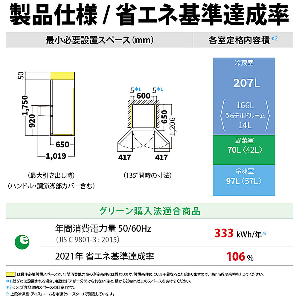 据付必要寸法:幅61.0 x 奥行65.0 x 高さ180.0cm
